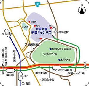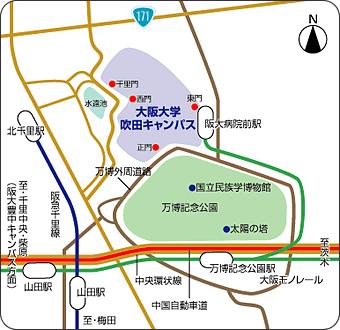 千里中央駅(地下鉄御堂筋線終点;梅田から約20分、新大阪から約15分)より千里中央バスターミナルから阪急バス 「阪大本部前」または「茨木美穂ヶ丘」行きに乗車し、「阪大本部前」バス停下車徒歩約5分。バスの所要時間は20分程度。 ※「新大阪駅」や「伊丹(大阪国際)空港」から来る場合に便利 です。