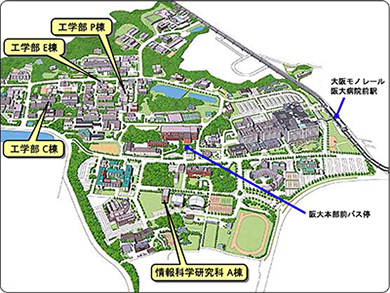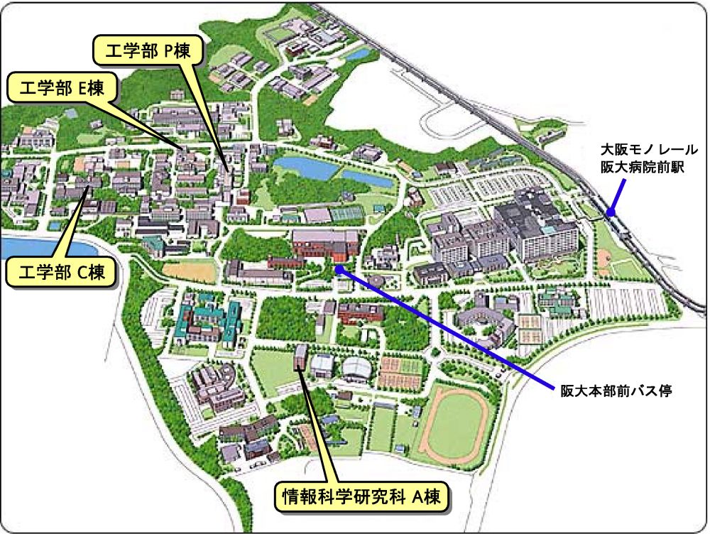 一般的な手段は下の3つ。 なお、タクシーをご利用の場合は「大阪大学 吹田キャンパス 情報科学研究科」まで。
